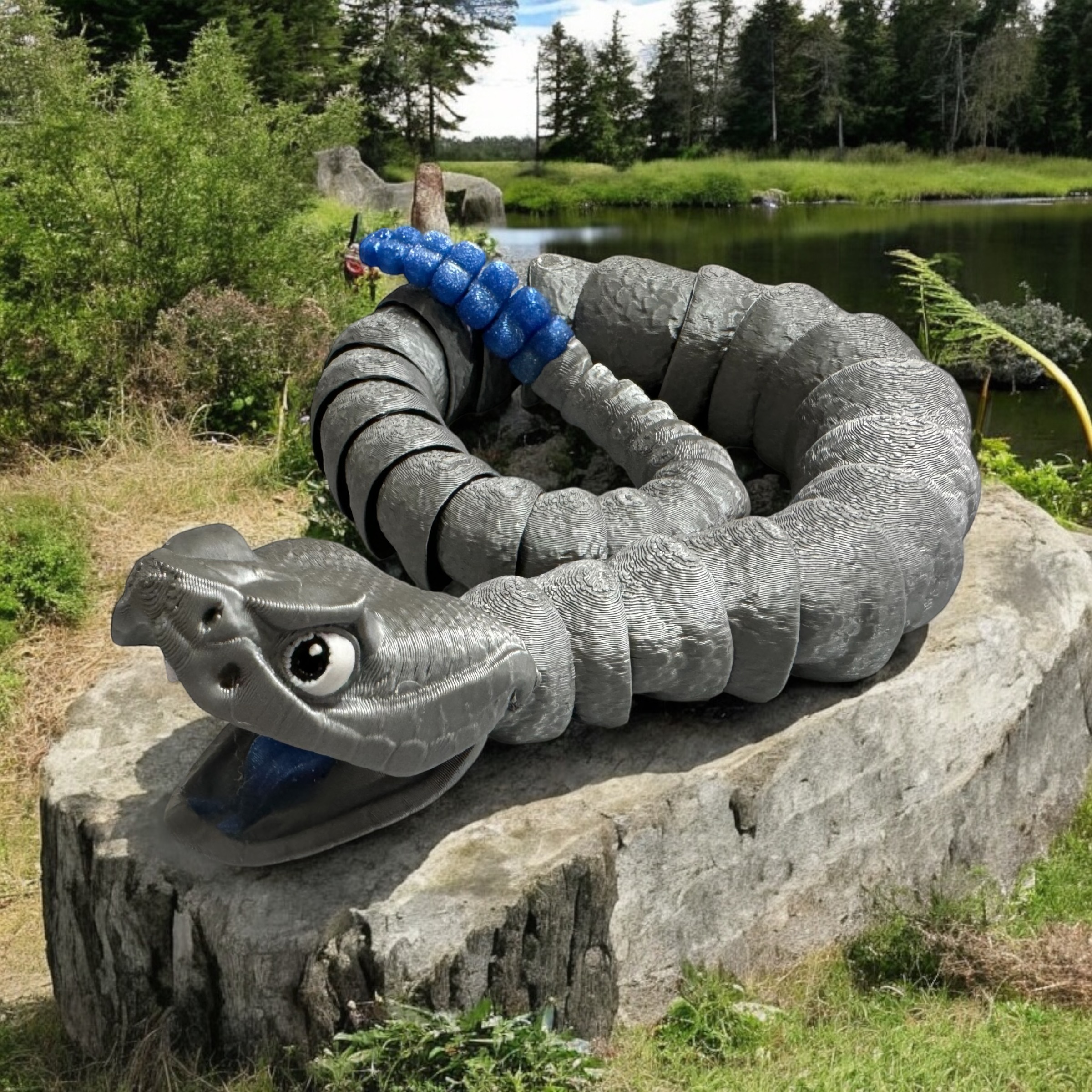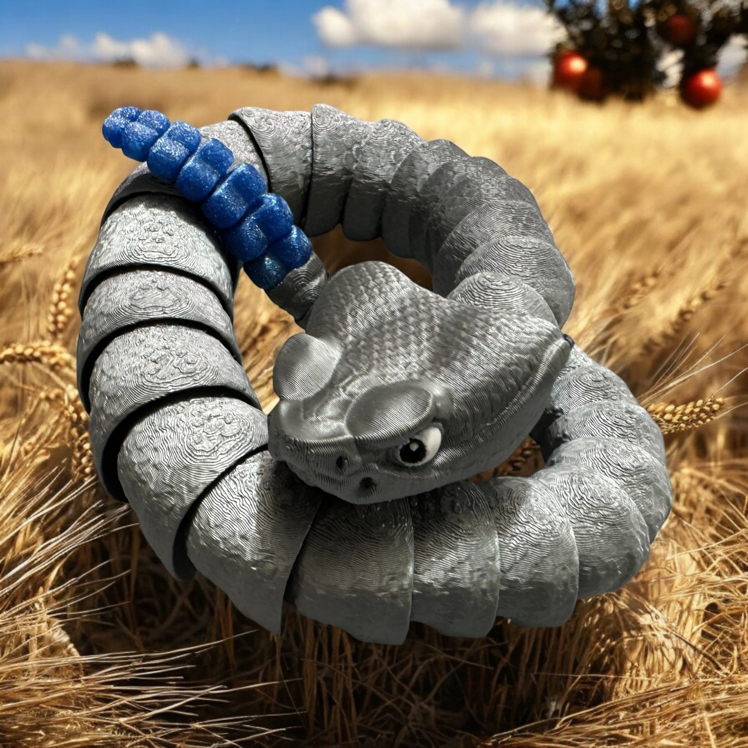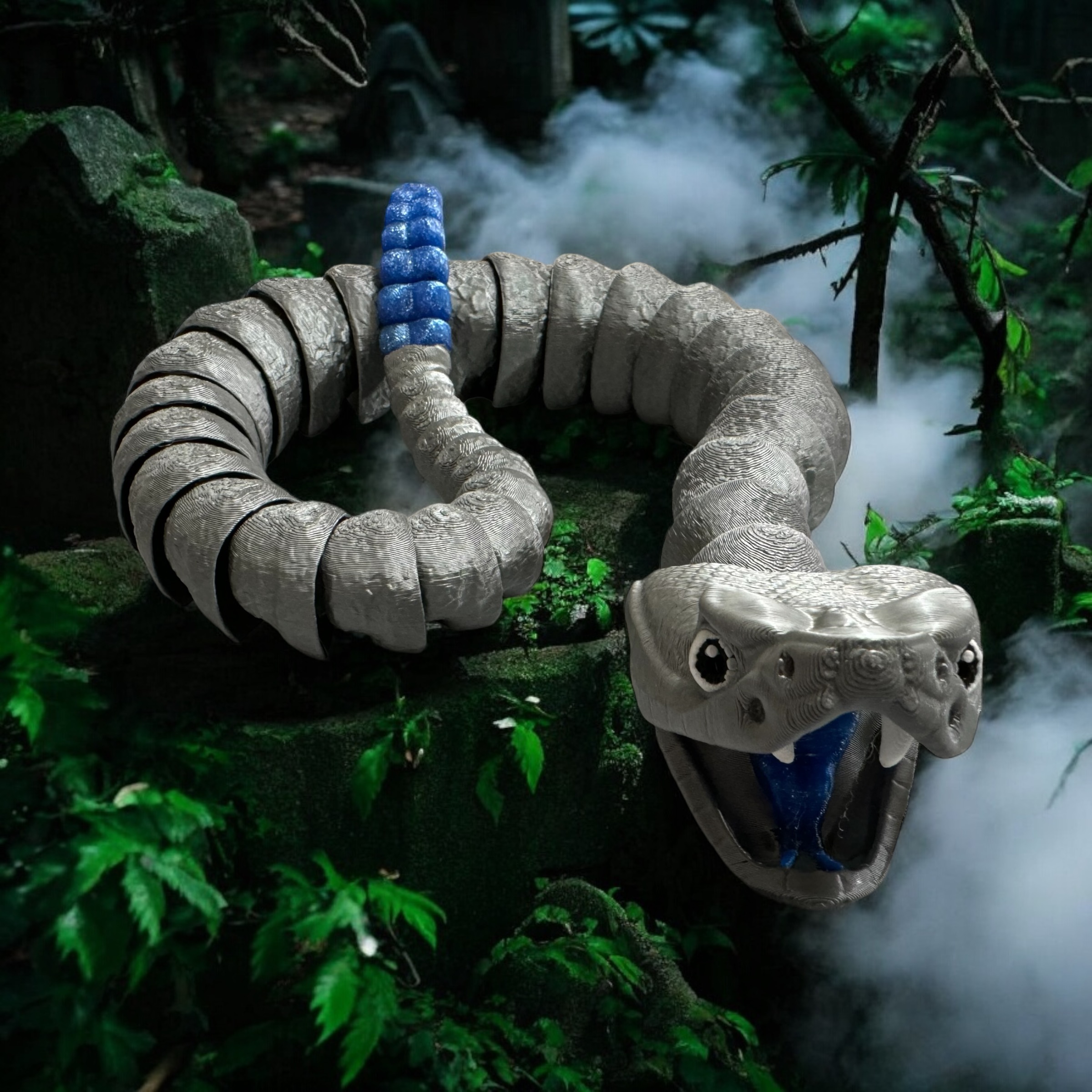 3D Printed Cartoon Rattlesnake in Silver, Glitter Blue, White, & Black PLA