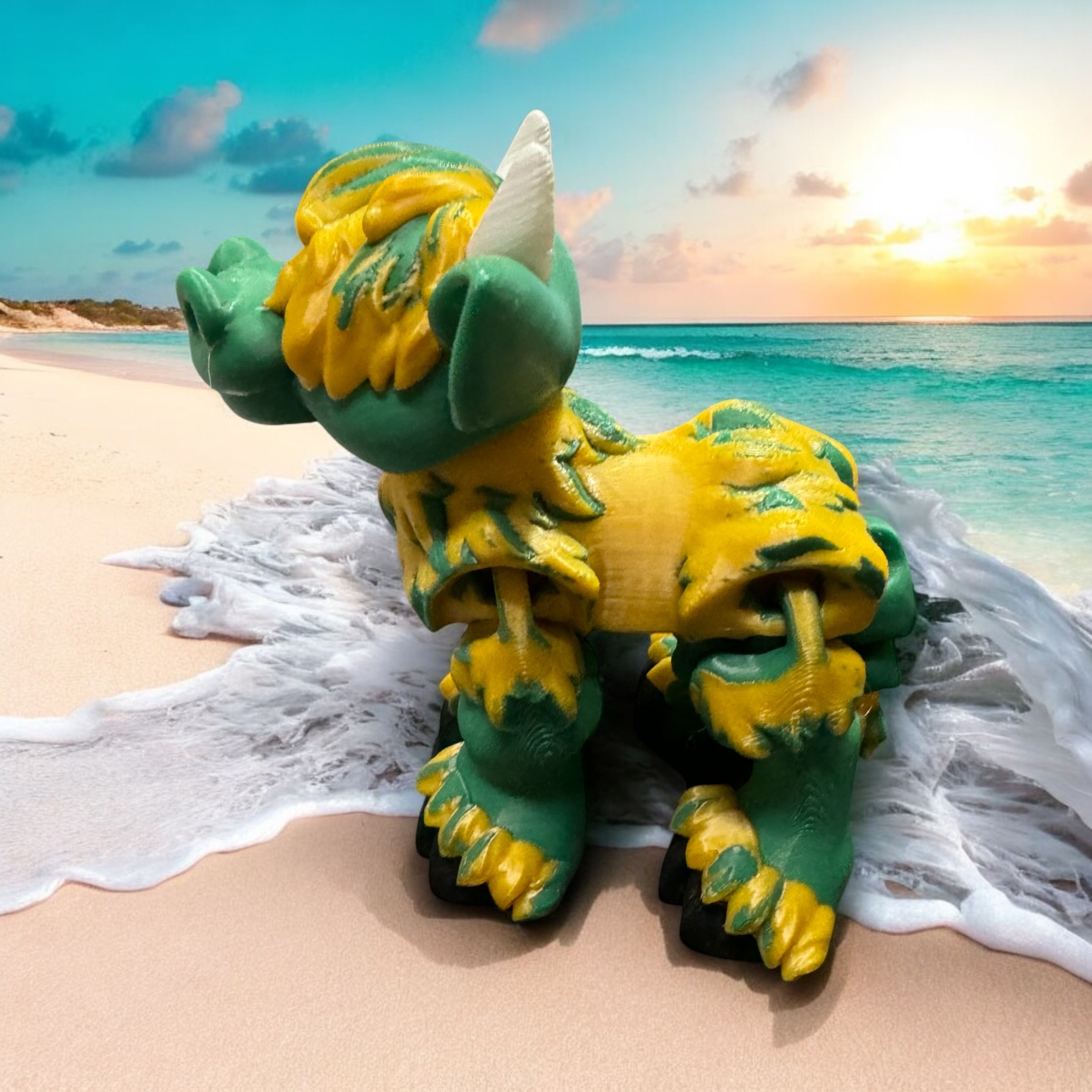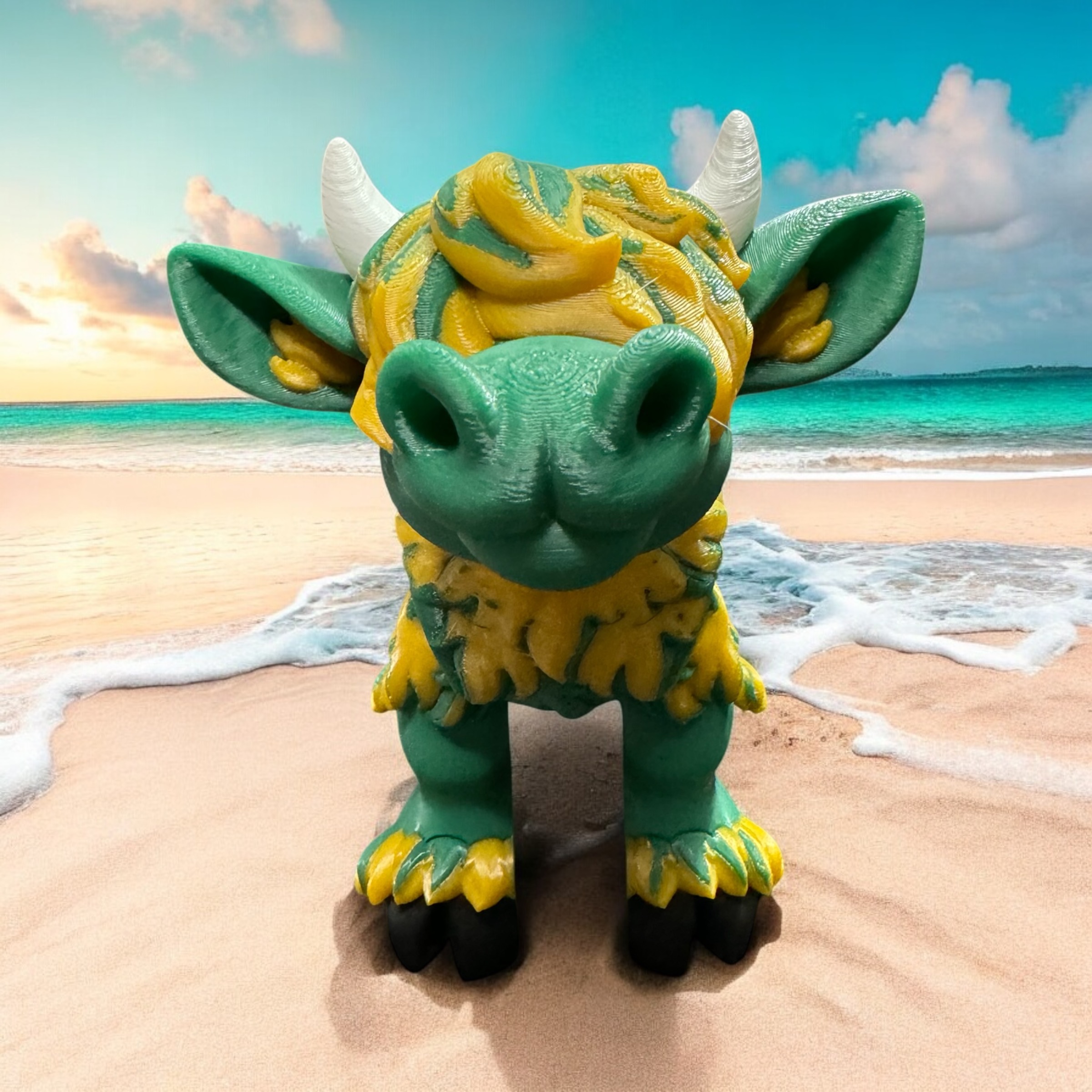 3D Printed Aquaman Highland Cow in Forest Green, Gold, White, & Black PLA