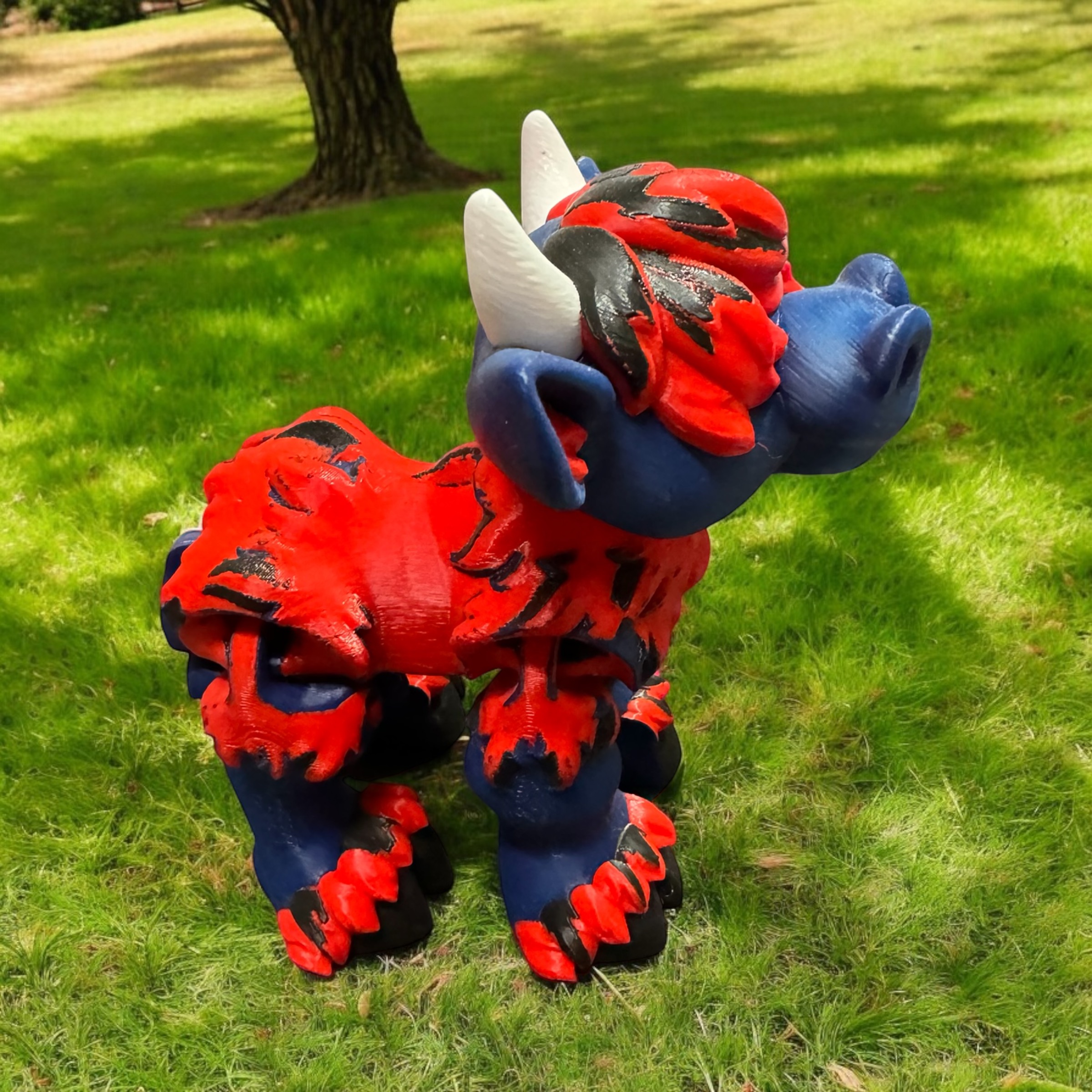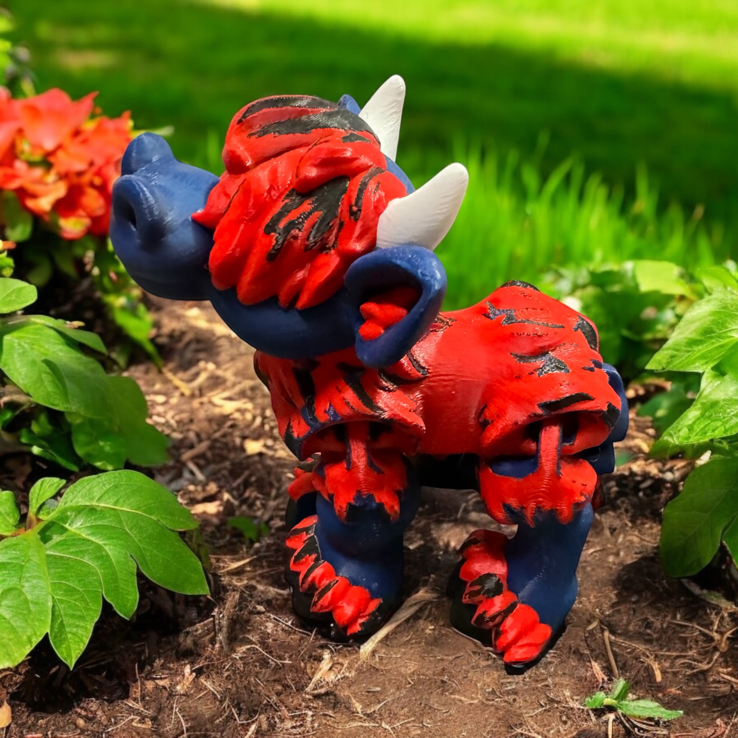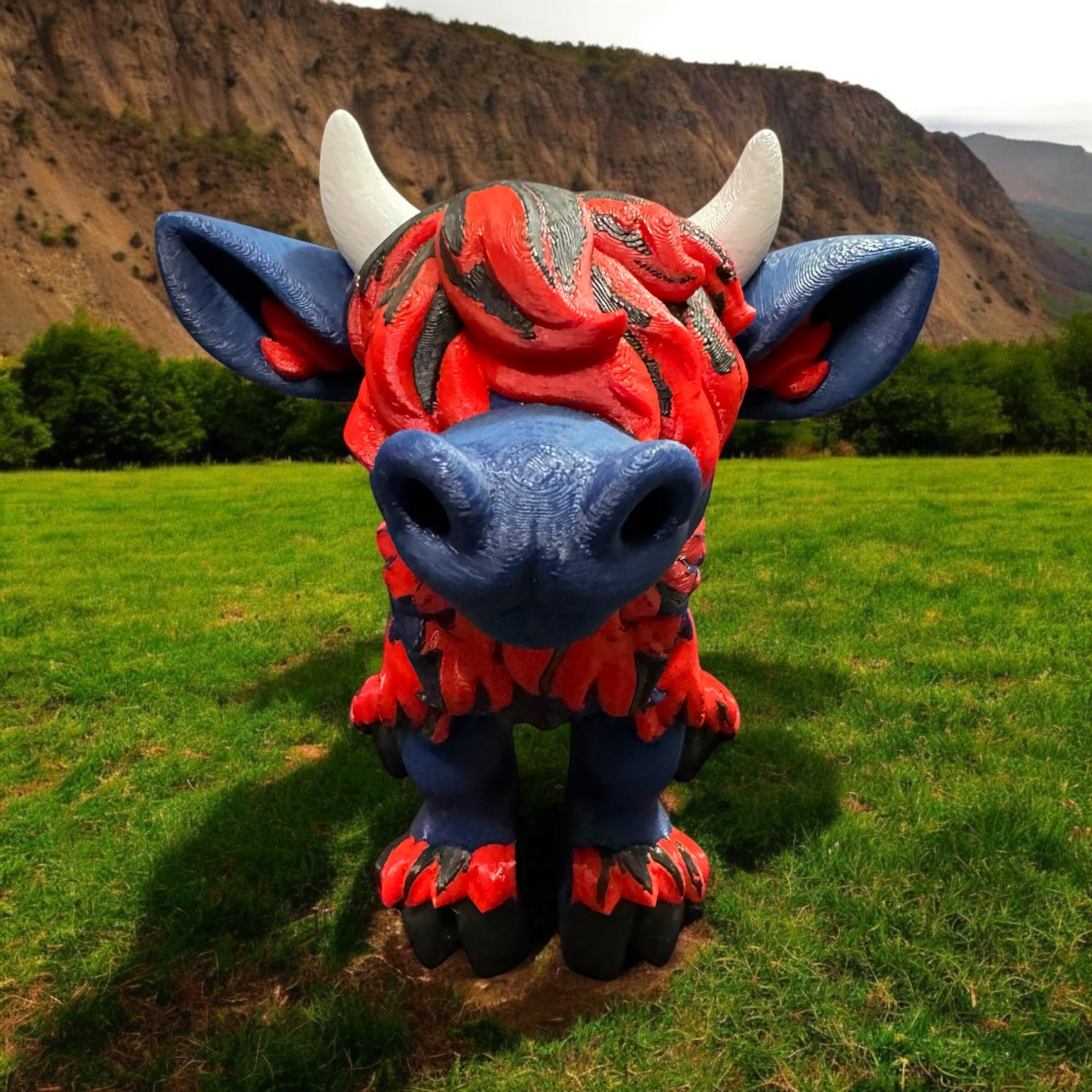 3D Printed Highland Cow in Navy Blue, Red, Black, & White PLA