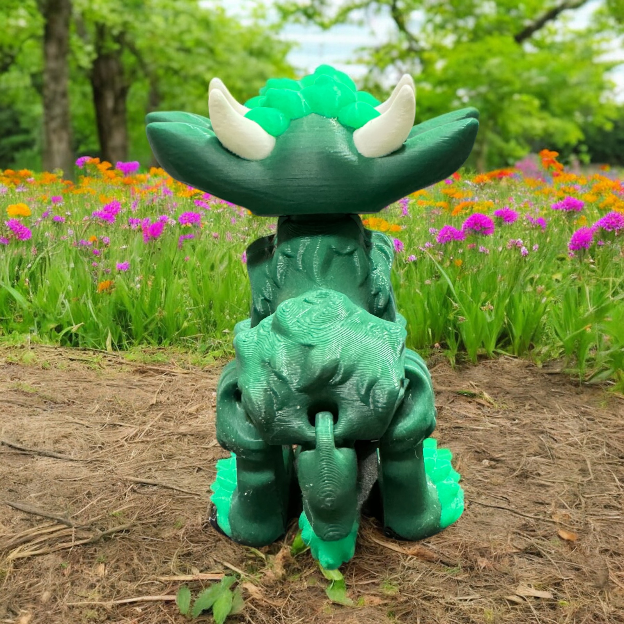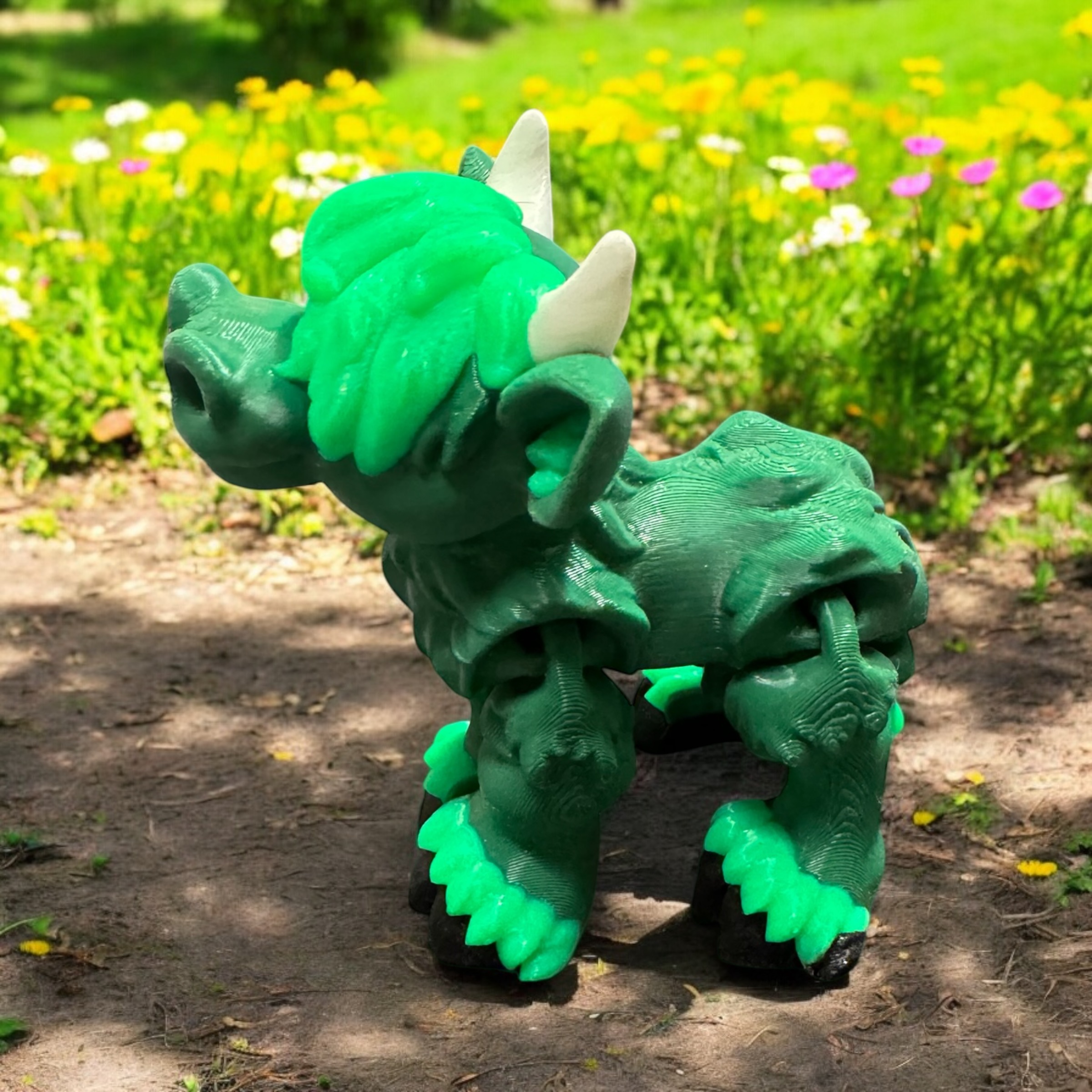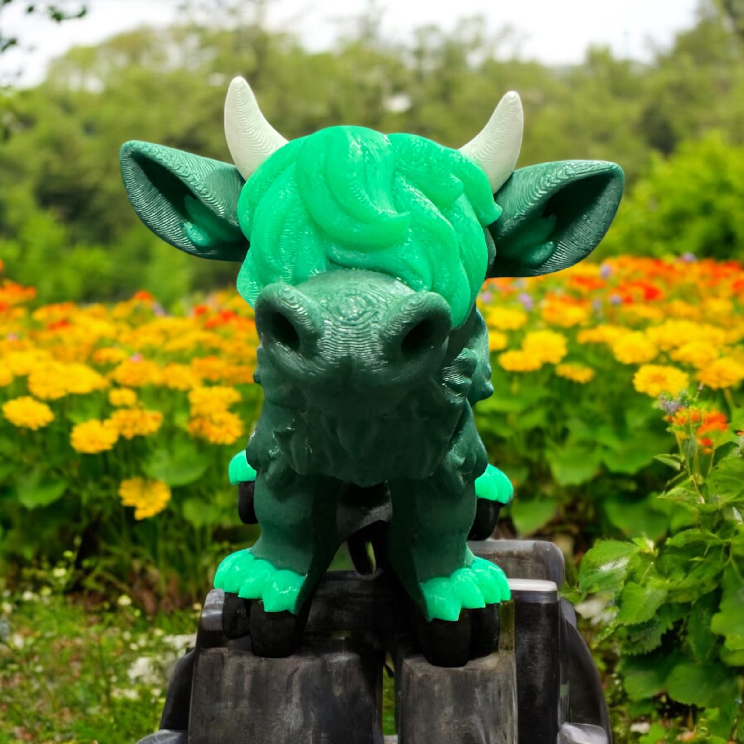 3D Printed Mini St Patrick’s Day Highland Cow in Forest Green, Neon Green, White & Black PLA